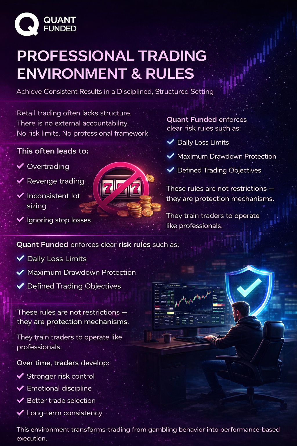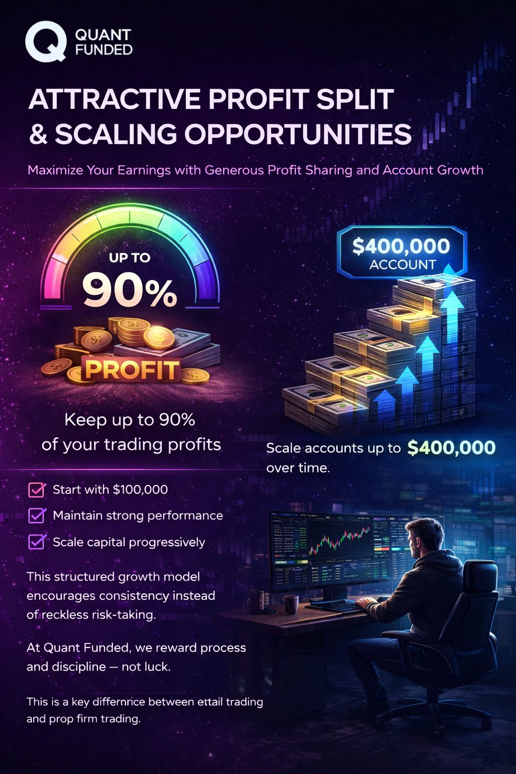 At Quant Funded, we reward process and discipline — not luck.