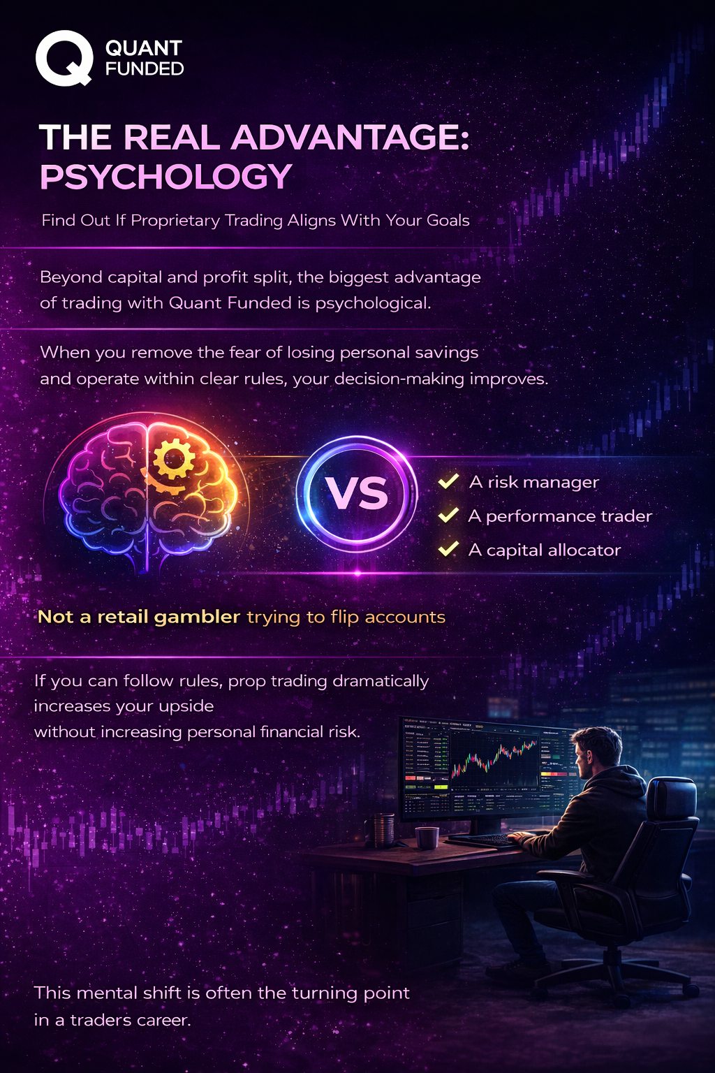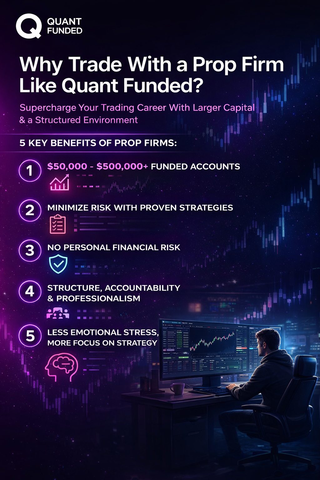 At Quant Funded, we provide traders with the opportunity to scale their performance, trade larger capital, and operate in a structured, professional environment. Below are five powerful reasons why trading with a prop firm like Quant Funded can be a smarter and more sustainable path forward.