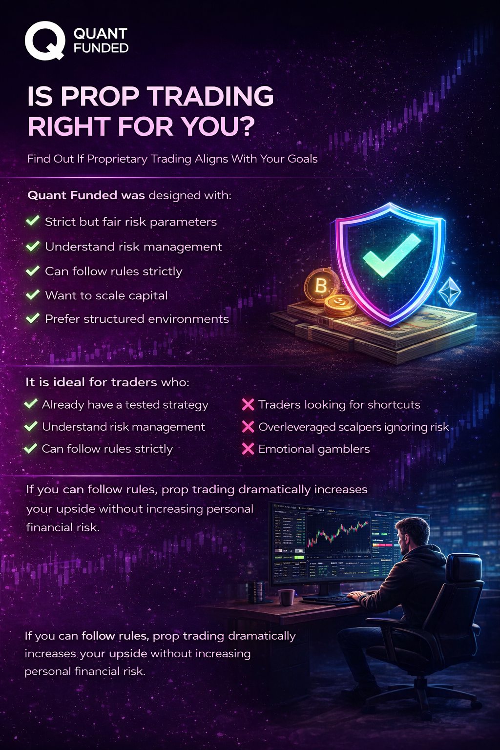 If you can follow rules, prop trading dramatically increases your upside without increasing personal financial risk.