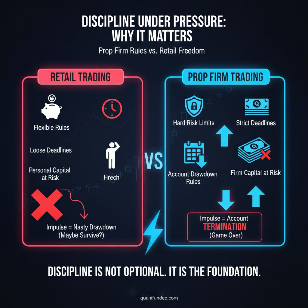 In a prop firm structure, discipline is not optional — it is the foundation that allows traders to protect capital and operate within strict risk parameters.