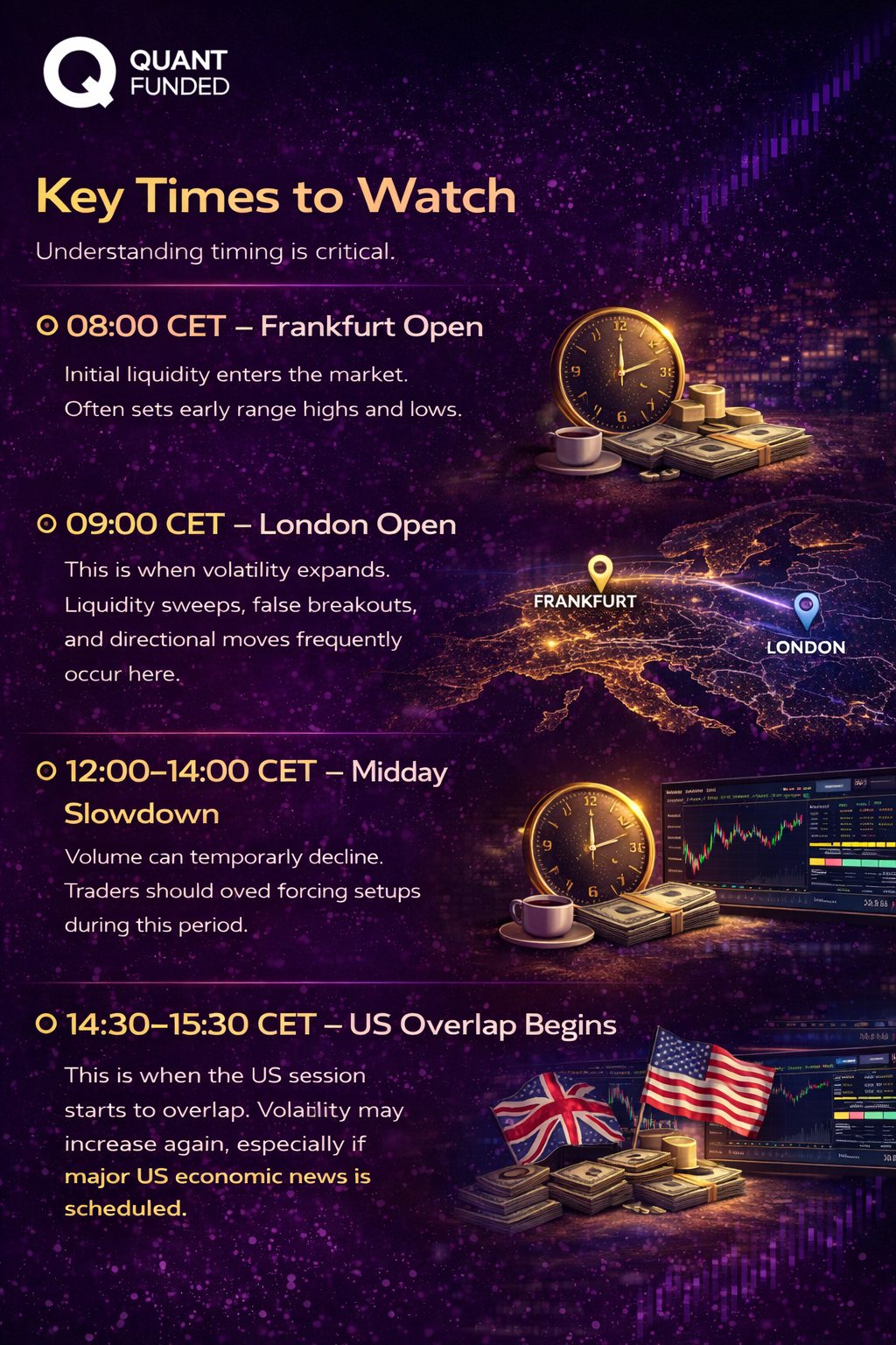 When trading under the Quant Funded evaluation model, discipline and risk management are essential. The European session supports this because it often provides: